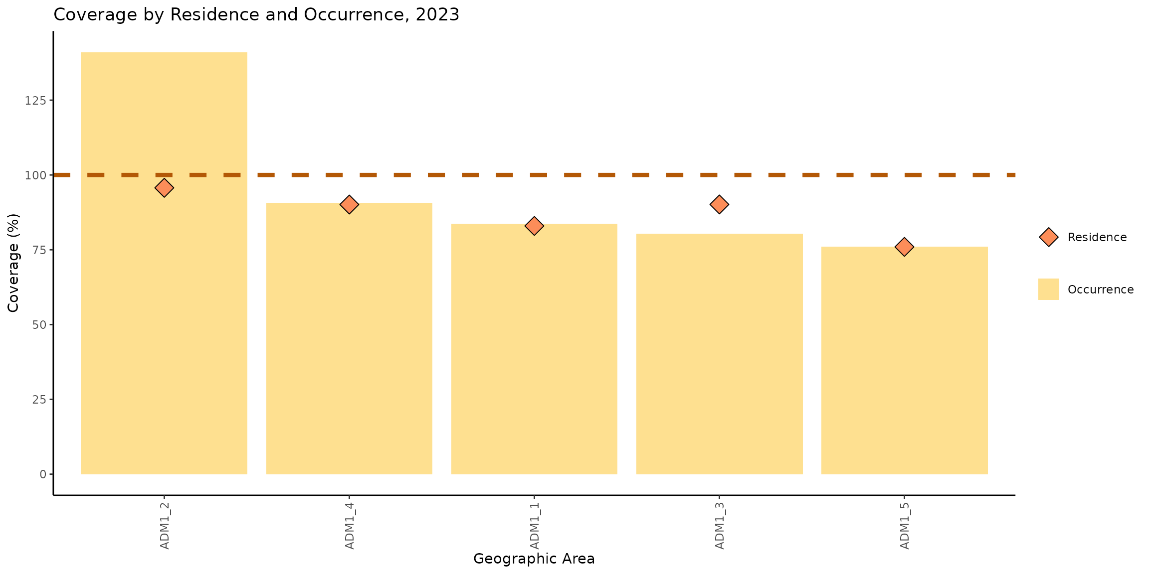 We can observe that the coverage by both residence and occurrence in ADM1_1, ADM1_4, and ADM1_5 are similar. However, in ADM1_2 and ADM1_3, there are differences between the two types of coverage.