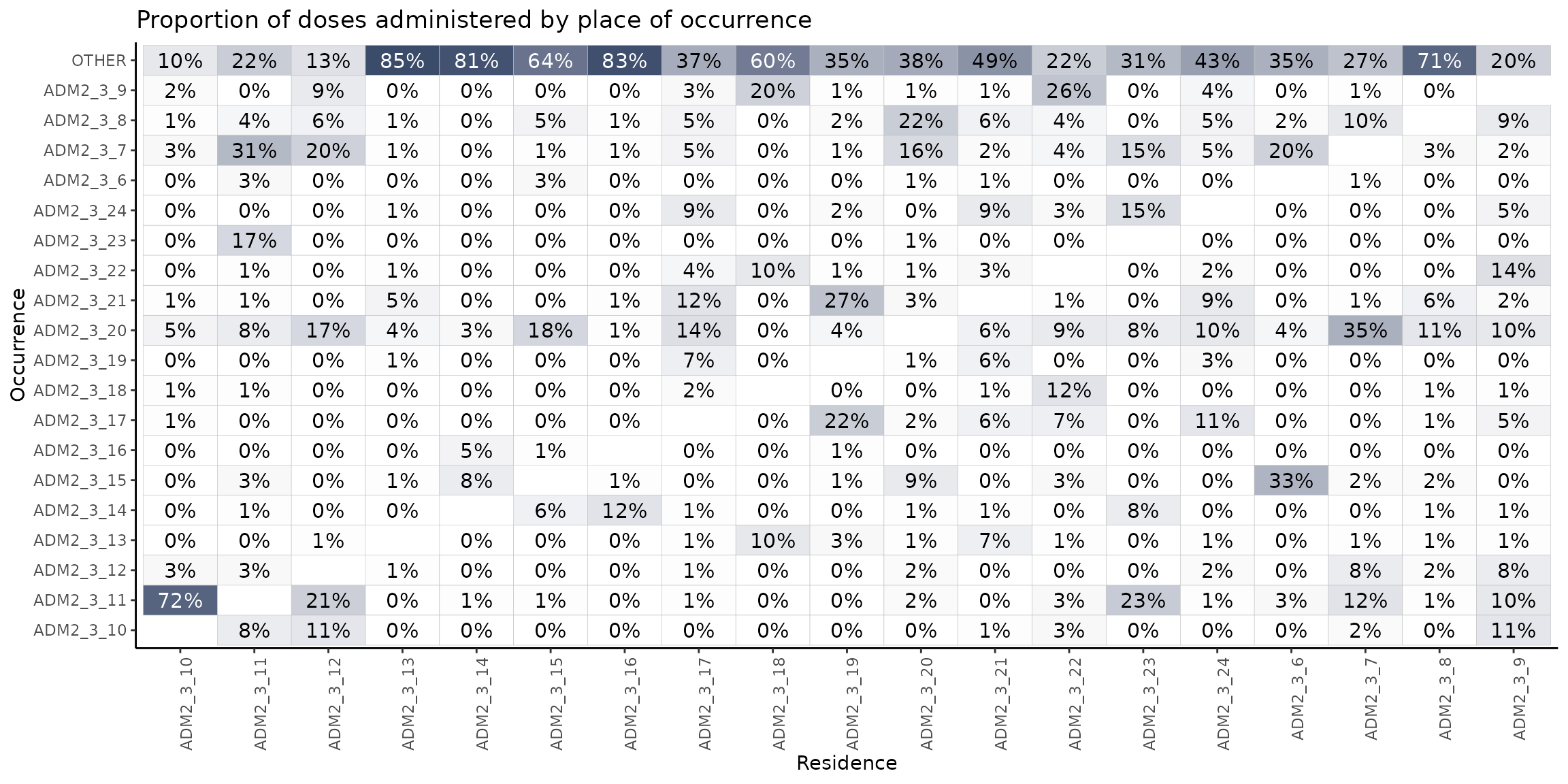 As an example, it is notable that among all individuals residing in ADM2_3_10 who are vaccinated outside their area of residence, 72% receive their vaccine in ADM2_3_11. Similarly, 23% of individuals from ADM2_3_23 who are vaccinated elsewhere, are vaccinated in ADM2_3_11.