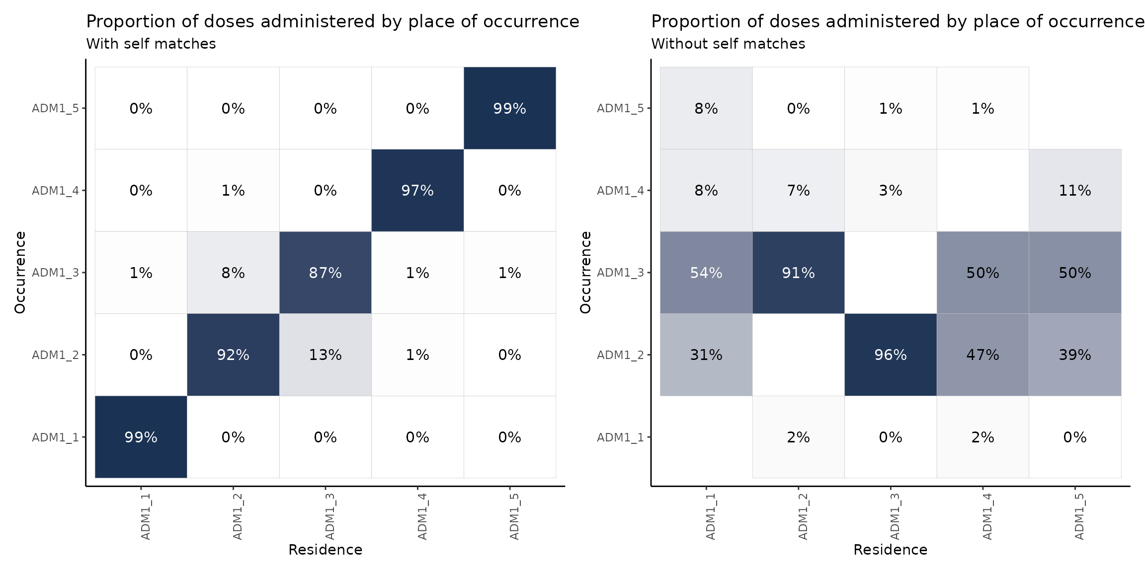 When reading horizontally, rows will not sum to 100%, but are still indicative of the residences of people getting vaccinated in a certain region. For example, reading the plot on the left in a horizontal fashion we may note that 92% of the residents of ADM1_2 get vaccinated there as well, but this region also vaccinates a significant proportion of residents of ADM1_3 (13%).